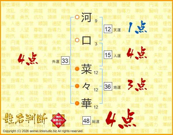 河(9画)口(3画) 菜(12画)々(12画)華(12画)