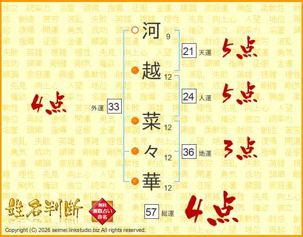 河(9画)越(12画) 菜(12画)々(12画)華(12画)