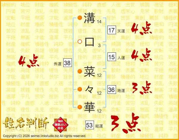 生活面を象徴する運勢です。外部から受ける影響力を表し、結婚運、家庭運や職場、環境への順応性を表します。総運から人運を引いた画数。姓や名が1文字の場合を除く。