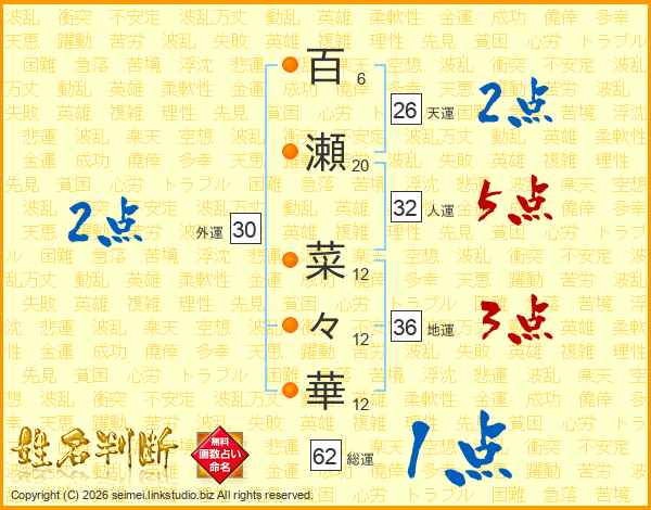 百(6画)瀬(20画) 菜(12画)々(12画)華(12画)
