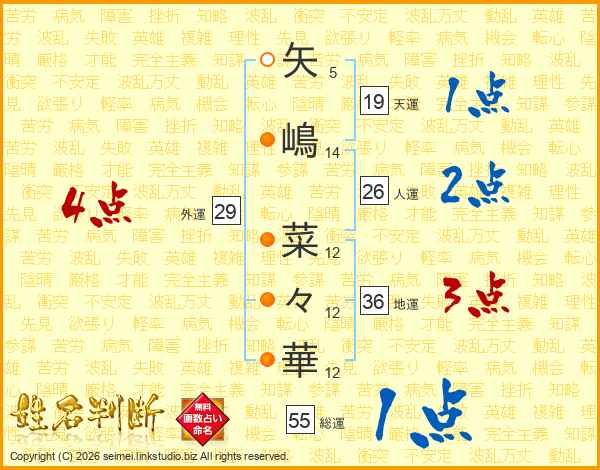 矢(5画)嶋(14画) 菜(12画)々(12画)華(12画)