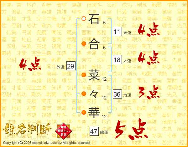 石(5画)合(6画) 菜(12画)々(12画)華(12画)