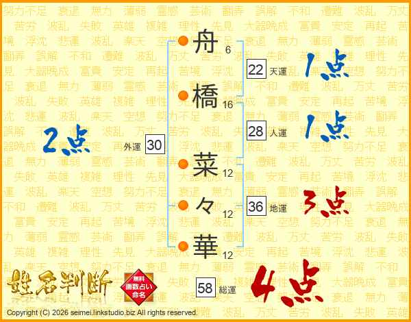 舟(6画)橋(16画) 菜(12画)々(12画)華(12画)