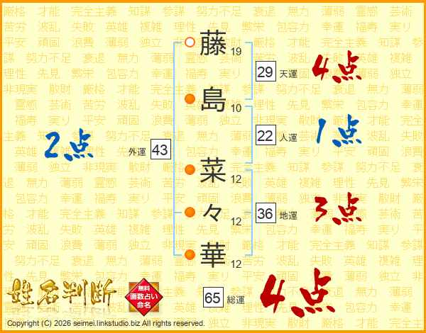 藤(19画)島(10画) 菜(12画)々(12画)華(12画)