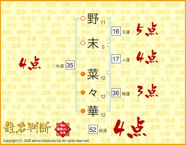 野末菜々華さんの総運は52画の4点!