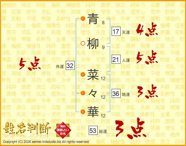 青(8画)柳(9画) 菜(12画)々(12画)華(12画)