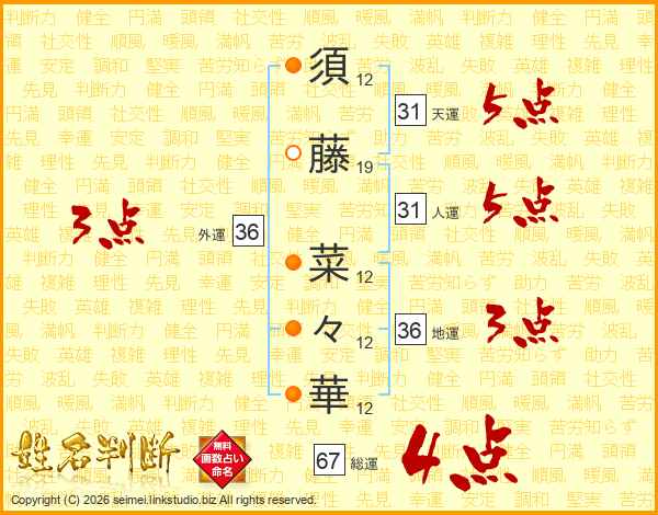 須藤菜々華さんの総運は67画の4点!