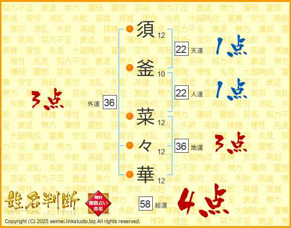 生活面を象徴する運勢です。外部から受ける影響力を表し、結婚運、家庭運や職場、環境への順応性を表します。総運から人運を引いた画数。姓や名が1文字の場合を除く。