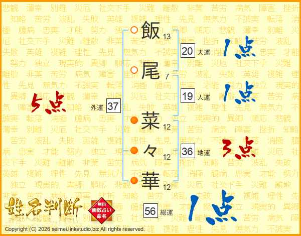 飯(13画)尾(7画) 菜(12画)々(12画)華(12画)