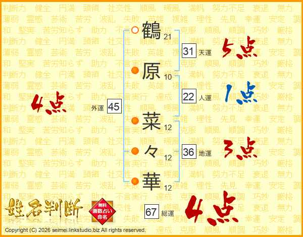 鶴(21画)原(10画) 菜(12画)々(12画)華(12画)