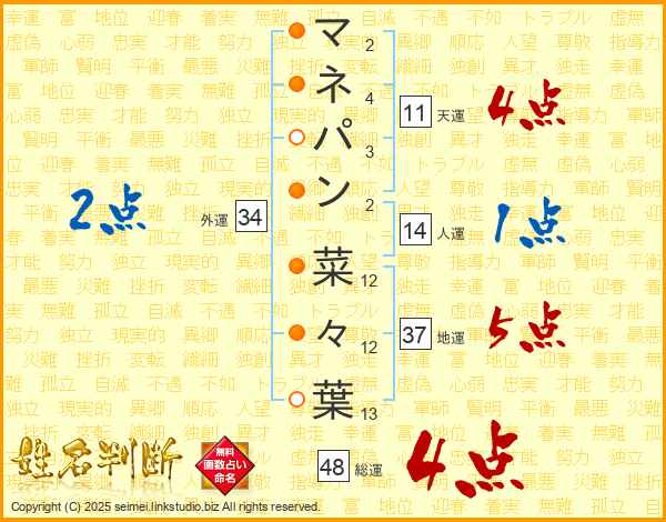 生活面を象徴する運勢です。外部から受ける影響力を表し、結婚運、家庭運や職場、環境への順応性を表します。総運から人運を引いた画数。姓や名が1文字の場合を除く。