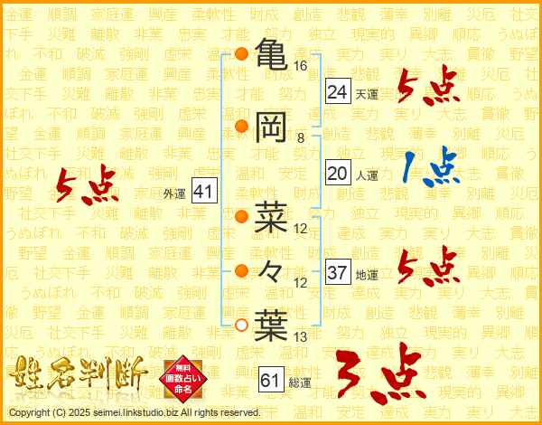 亀(16画)岡(8画) 菜(12画)々(12画)葉(13画)
