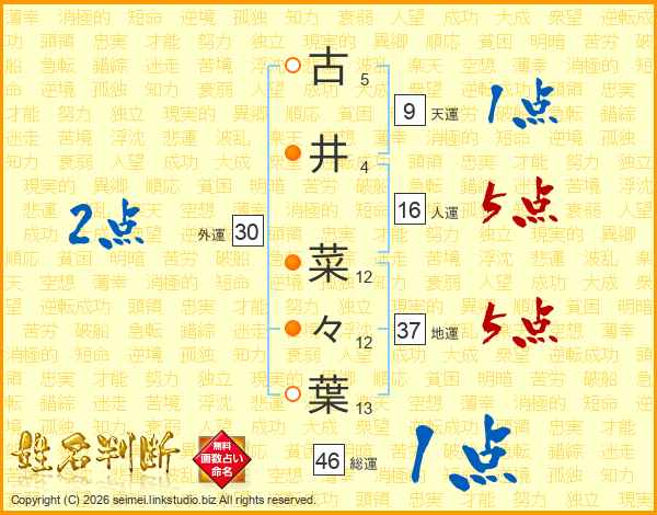 古(5画)井(4画) 菜(12画)々(12画)葉(13画)