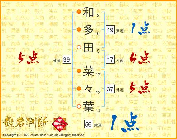 和(8画)多(6画)田(5画) 菜(12画)々(12画)葉(13画)