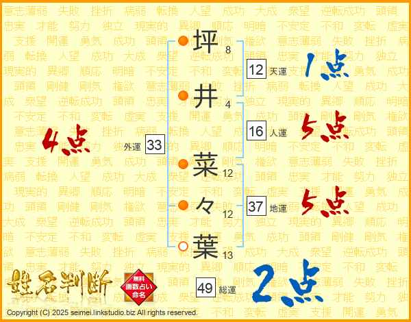 坪(8画)井(4画) 菜(12画)々(12画)葉(13画)