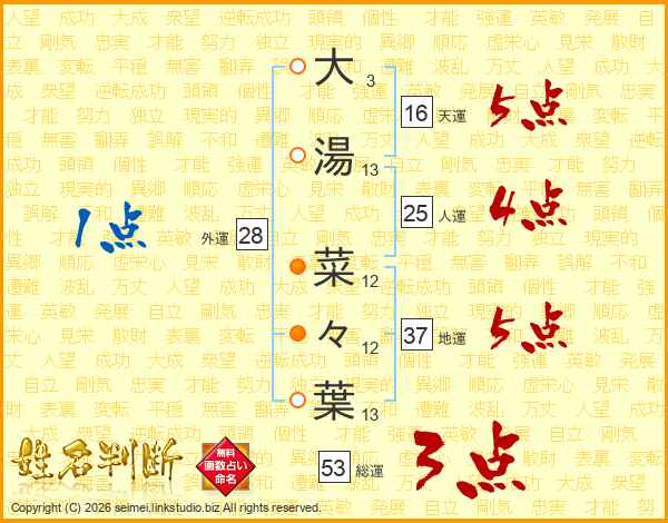 大(3画)湯(13画) 菜(12画)々(12画)葉(13画)