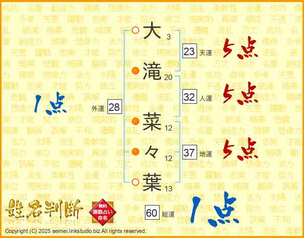 大(3画)滝(20画) 菜(12画)々(12画)葉(13画)