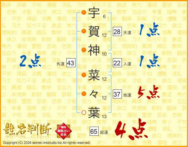宇(6画)賀(12画)神(10画) 菜(12画)々(12画)葉(13画)