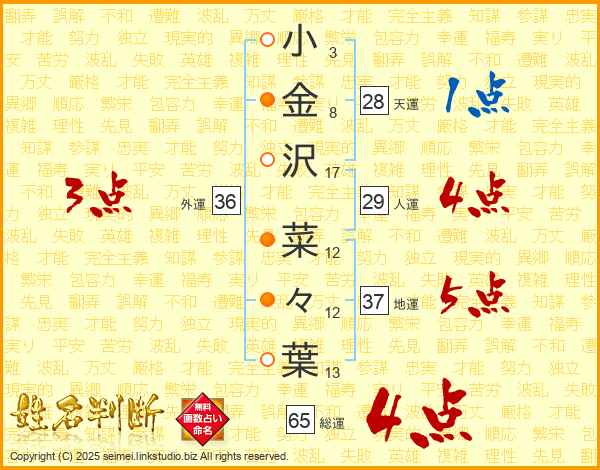 小(3画)金(8画)沢(17画) 菜(12画)々(12画)葉(13画)