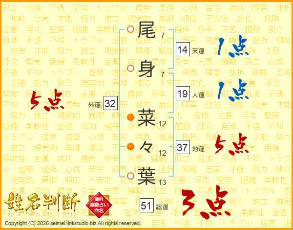 尾(7画)身(7画) 菜(12画)々(12画)葉(13画)