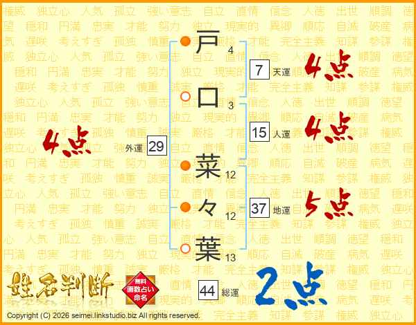 戸(4画)口(3画) 菜(12画)々(12画)葉(13画)