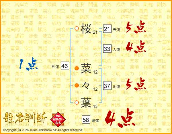 桜菜々葉さんの総運は58画の4点!