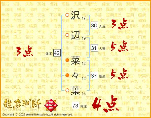 沢(17画)辺(19画) 菜(12画)々(12画)葉(13画)