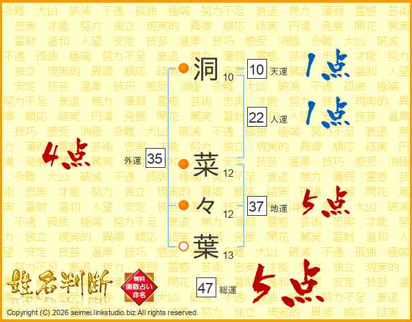 洞(10画) 菜(12画)々(12画)葉(13画)