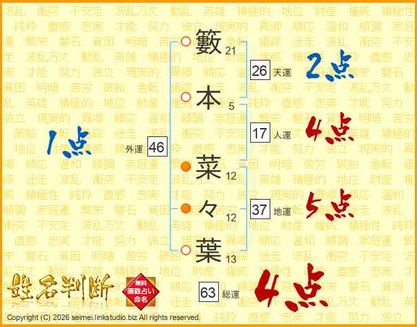 籔(21画)本(5画) 菜(12画)々(12画)葉(13画)