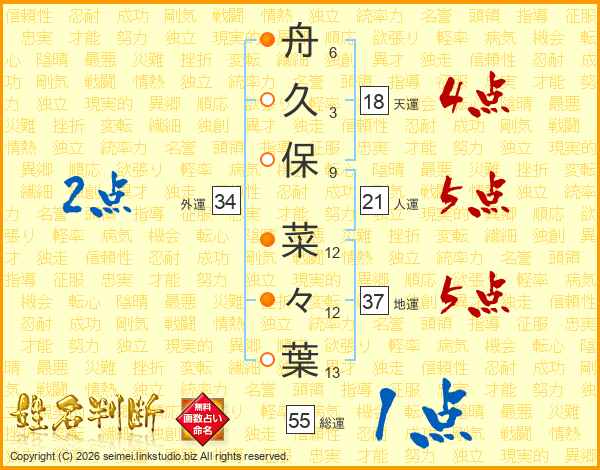 舟(6画)久(3画)保(9画) 菜(12画)々(12画)葉(13画)