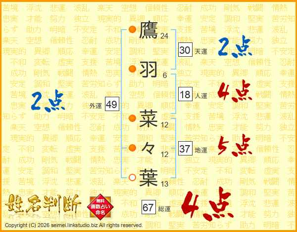 鷹(24画)羽(6画) 菜(12画)々(12画)葉(13画)