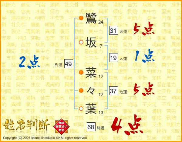 鷺(24画)坂(7画) 菜(12画)々(12画)葉(13画)