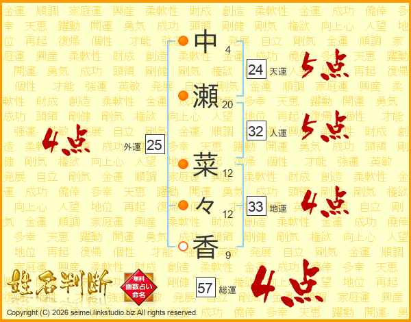 中(4画)瀬(20画) 菜(12画)々(12画)香(9画)