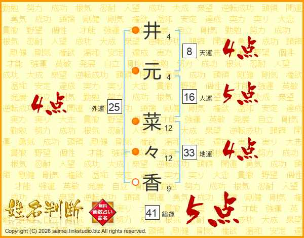 井(4画)元(4画) 菜(12画)々(12画)香(9画)