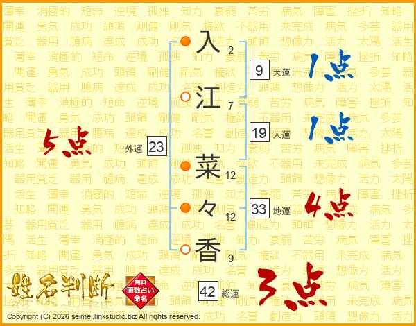 入(2画)江(7画) 菜(12画)々(12画)香(9画)
