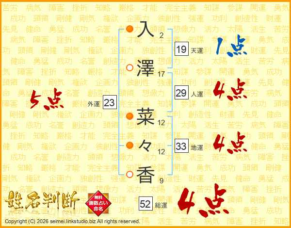 入(2画)澤(17画) 菜(12画)々(12画)香(9画)
