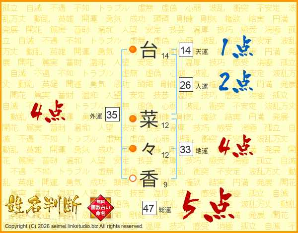 生活面を象徴する運勢です。外部から受ける影響力を表し、結婚運、家庭運や職場、環境への順応性を表します。総運から人運を引いた画数。姓や名が1文字の場合を除く。