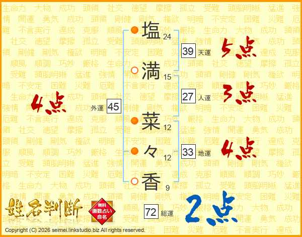 塩(24画)満(15画) 菜(12画)々(12画)香(9画)