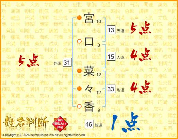宮(10画)口(3画) 菜(12画)々(12画)香(9画)