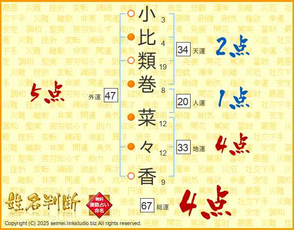 小(3画)比(4画)類(19画)巻(8画) 菜(12画)々(12画)香(9画)