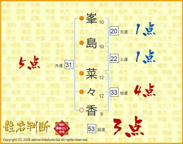 峯(10画)島(10画) 菜(12画)々(12画)香(9画)