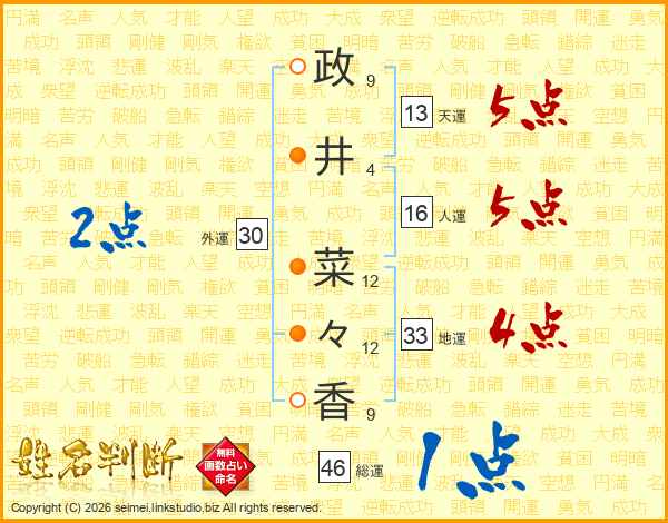 政(9画)井(4画) 菜(12画)々(12画)香(9画)