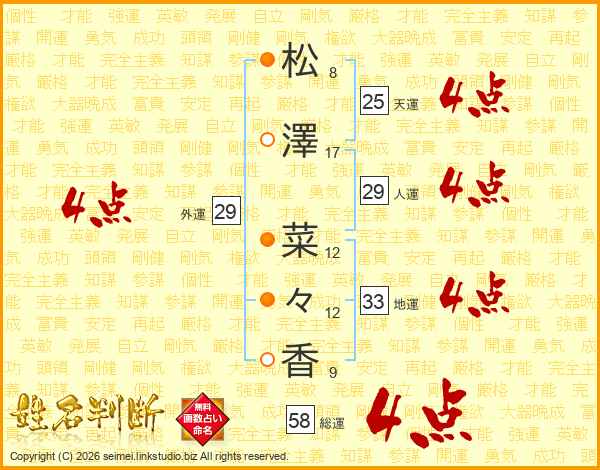 松(8画)澤(17画) 菜(12画)々(12画)香(9画)
