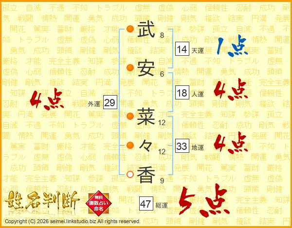武(8画)安(6画) 菜(12画)々(12画)香(9画)