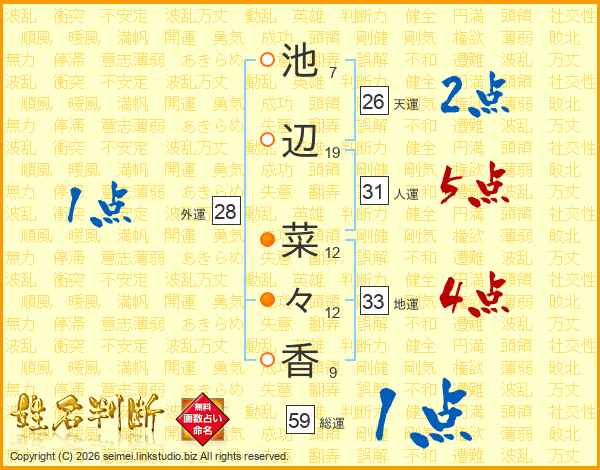 池(7画)辺(19画) 菜(12画)々(12画)香(9画)