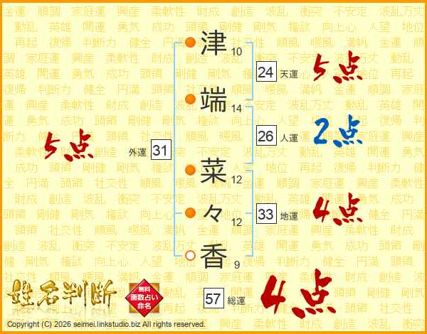 津(10画)端(14画) 菜(12画)々(12画)香(9画)