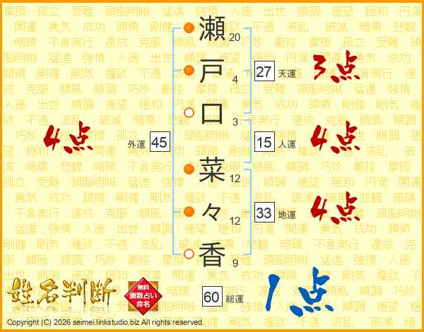 瀬(20画)戸(4画)口(3画) 菜(12画)々(12画)香(9画)