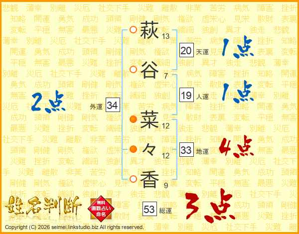 萩(13画)谷(7画) 菜(12画)々(12画)香(9画)
