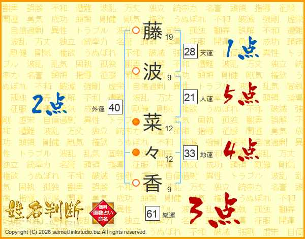 藤(19画)波(9画) 菜(12画)々(12画)香(9画)