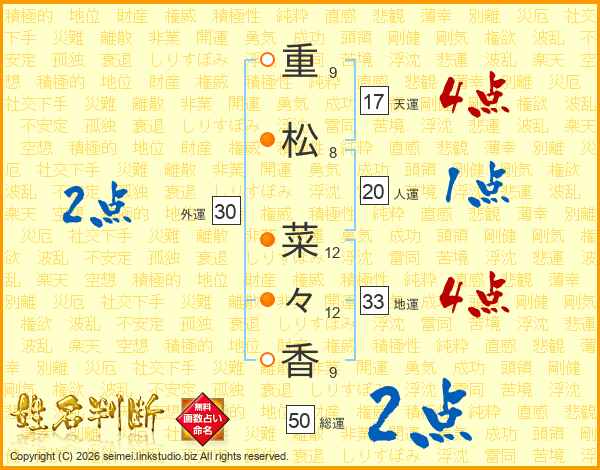 重(9画)松(8画) 菜(12画)々(12画)香(9画)